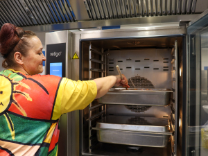 Ja, Grillen. Wir grillen zum Beispiel Lachs. Wir haben gerade 140 kg Bratkartoffeln gemacht. Wir haben sie in Dritteln geröstet und der Koch hat den ganzen Vormittag dafür gebraucht. Wenn wir süße Hefeknödel im Kombidämpfer zubereiten, verwenden wir 35 kg Mehl. Die Vorbereitung ist auch zeitaufwendig. Wir fangen gegen halb fünf an. Aber dann stellen wir das Programm des Kombidämpfers ein und müssen uns um nichts mehr kümmern. Es ist nicht mehr so wie früher, als die Teigtaschen in einem Topf zubereitet und dann gewendet, herausgenommen und eingestochen werden mussten. Und wir sind mit dem Ergebnis äußerst zufrieden. Die Teigtaschen sehen wunderschön aus.
