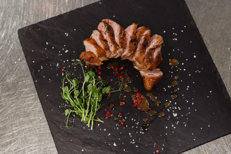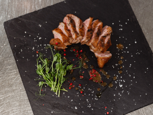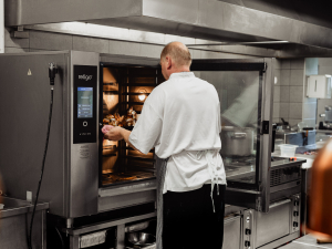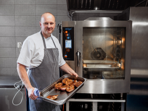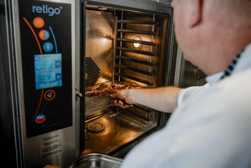 Wir backen und räuchern Fleisch in den Kombidämpfern, hauptsächlich Wild, Rinderfilet, Hähnchen und Schweinefleisch. Auch Beilagen werden darin zubereitet.